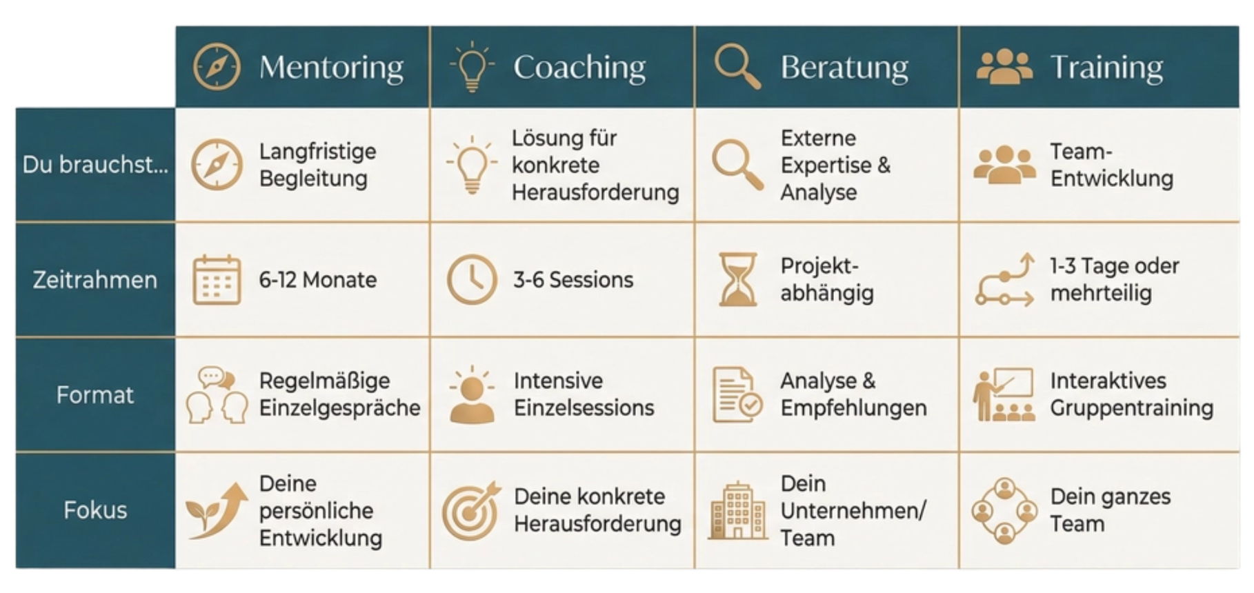 Hier findest du das Angebot, das zu deiner Situation passt. Alle vier Formate arbeiten nach dem gleichen Prinzip: Ich höre zu, stelle Fragen und unterstütze dabei, das freizulegen, was bereits in dir oder deinem Team steckt.
